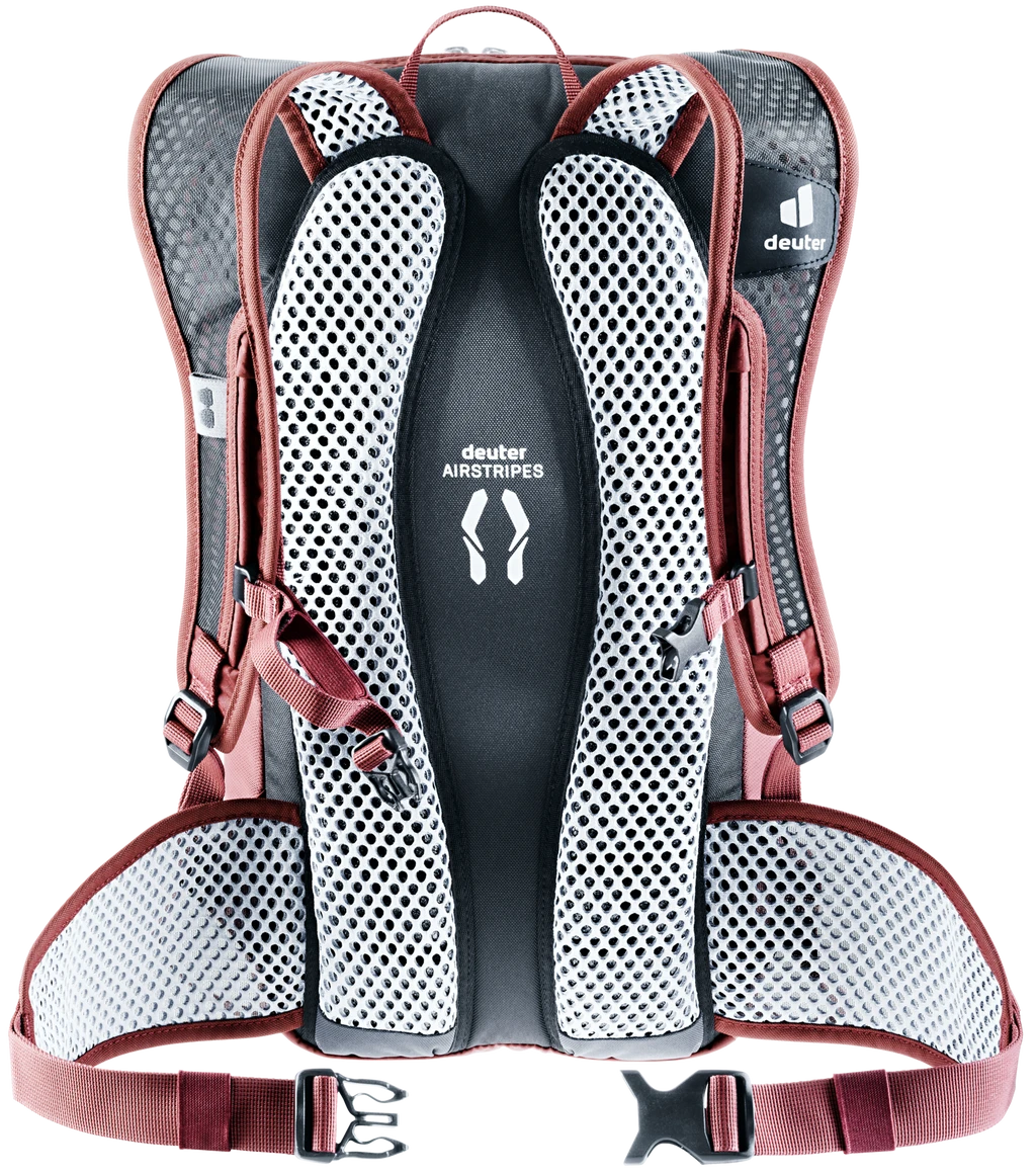 - ANGENEHME BELÜFTUNGund sicheren Sitz für hohe Fahrsicherheit garantiert das Airstripes System. Der Rucksack sitzt nah und fest am Rücken und kann nicht ausbrechen. Die geringe Rückenauflage der Polster mit Belüftungskanälen sowie der Kamineffekt zwischen den Polstern ermöglichen auf über 80% des Rückens eine freie Luftzirkulation.