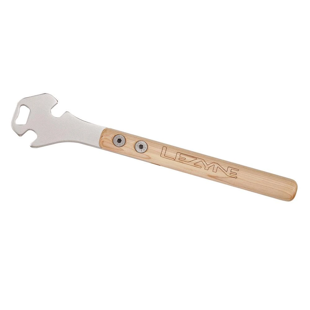 Hochwertiger Pedalschlüssel in Werkstattqualität. Entworfen mit zwei 15mm Schraubenschlüsselöffnungen für optimale Hebelwirkung und leichte Nutzung. Der Werkzeugkopf ist aus einer geprägten, CNC-gefrästen und hitzebehandelten Stahlplatte hergestellt und verfügt außerdem über einen integrierten Flaschenöffner. Ein optimal geformter und mit lackiertem Holz versehener Griff sorgt für den klassischen Look und perfekten Grip.